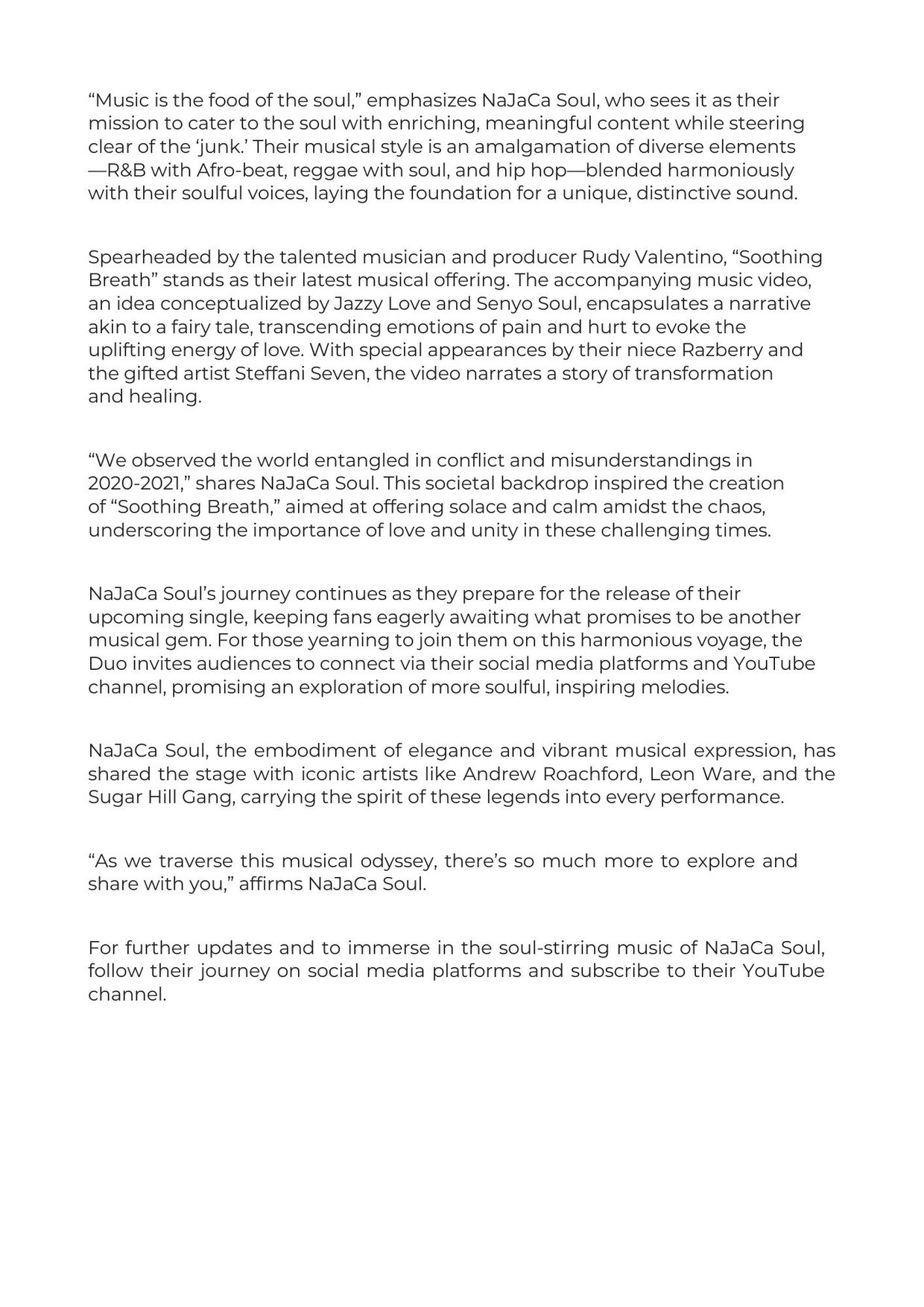 NaJaCa will be releasing their next Single "Time To Heal" on all streaming platforms soon but before then you will be given the opportunity to listen to it right here first. Time To Heal is now available on this website. Head to the Music page and enjoy. "It's about time for a new single and it's time to heal." - NaJaCa Soul